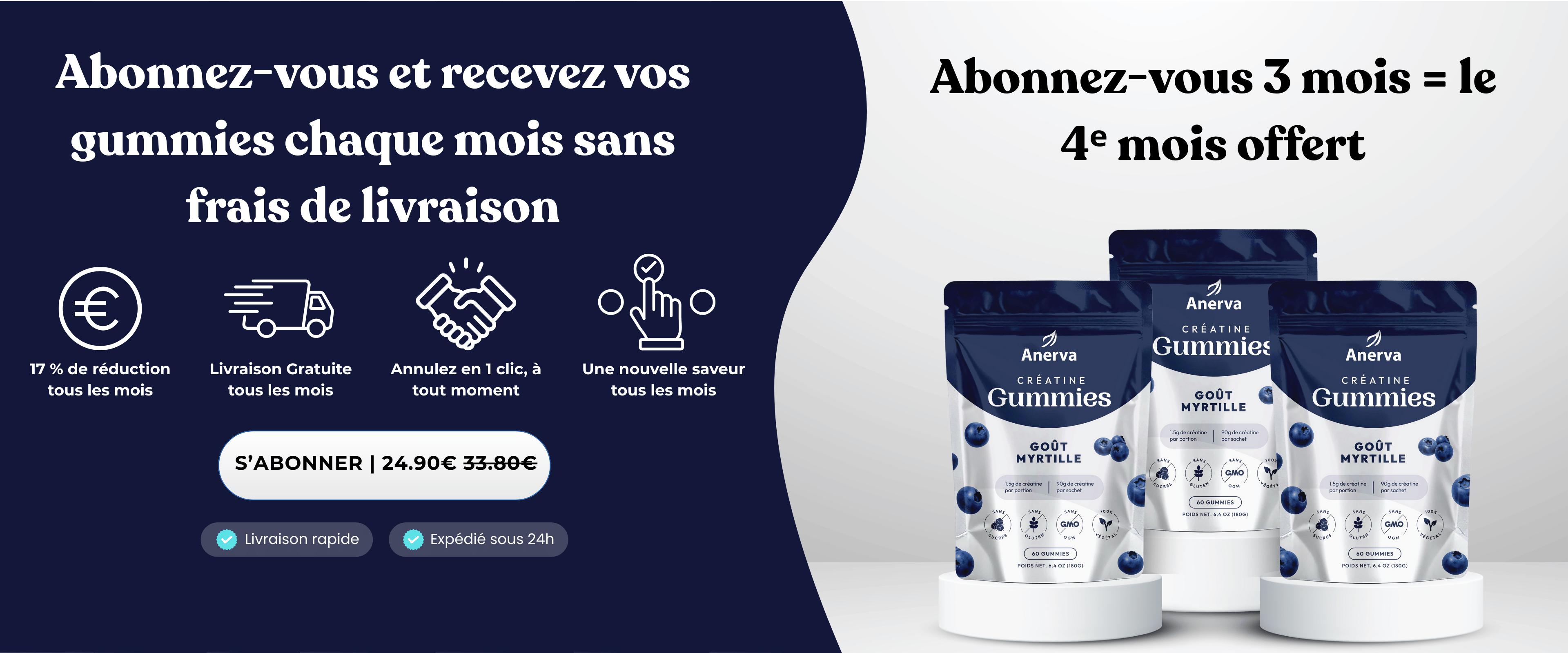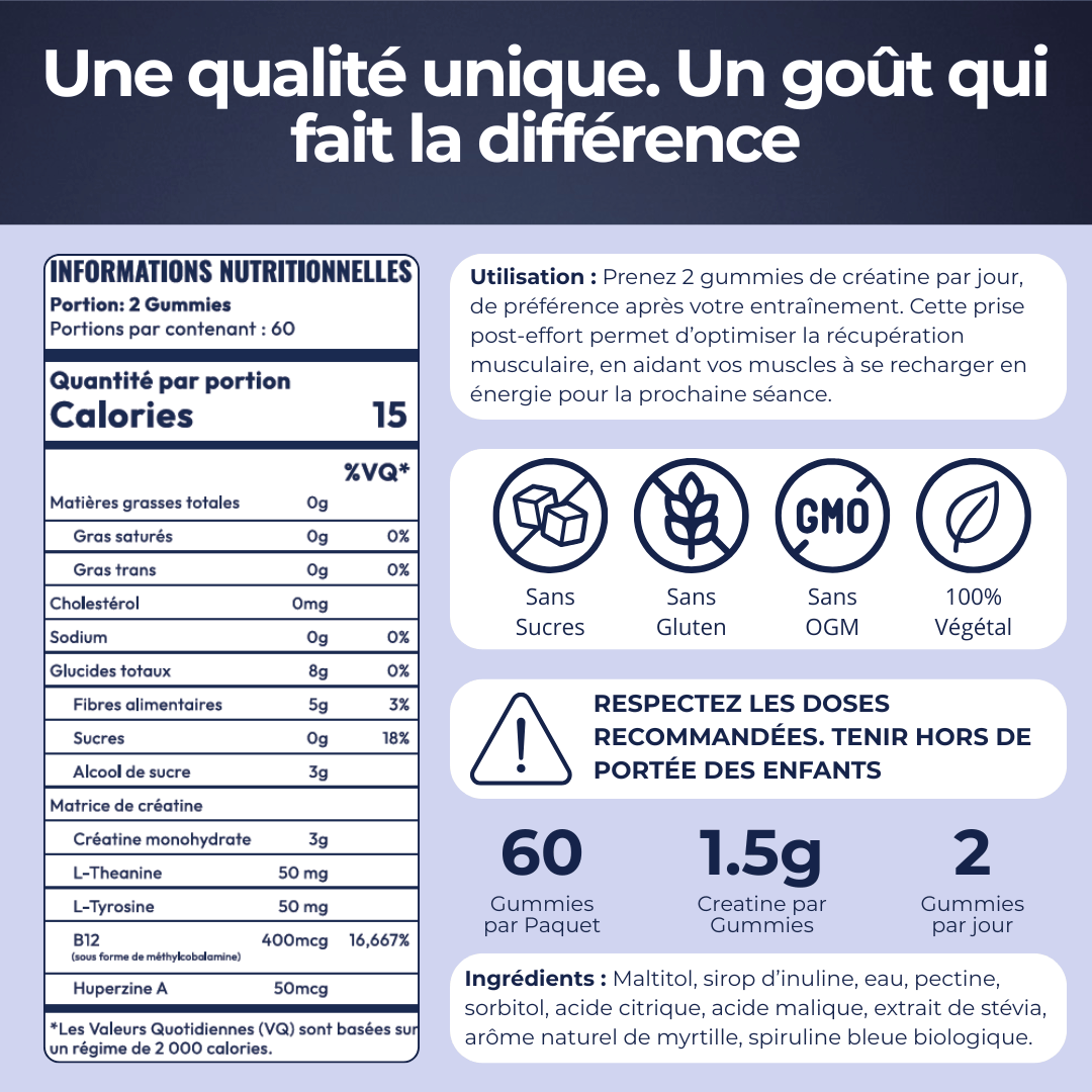 Il est recommandé de prendre 2 gummies par jour, contenant chacun 1,5 g de créatine, soit un total de 3 g de créatine par jour.