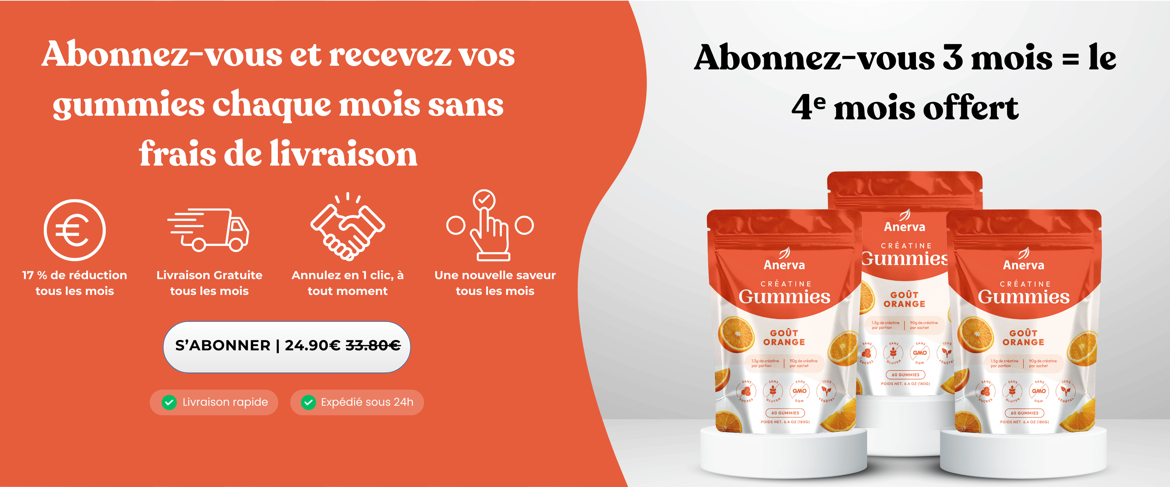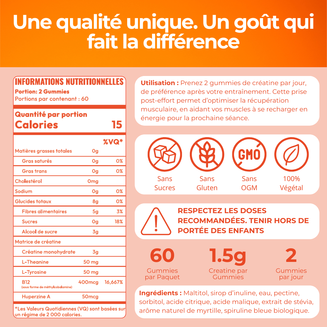 Il est recommandé de prendre 2 gummies par jour, contenant chacun 1,5 g de créatine, soit un total de 3 g de créatine par jour.