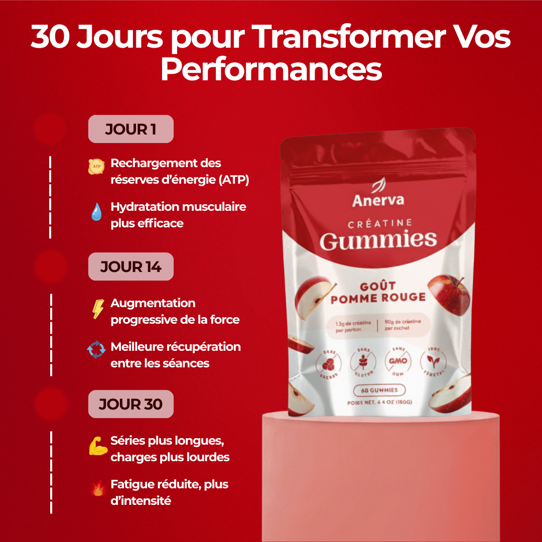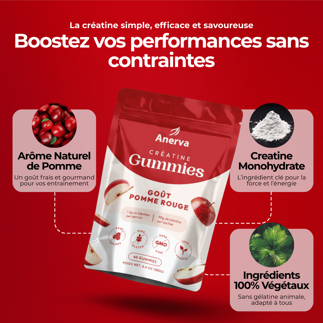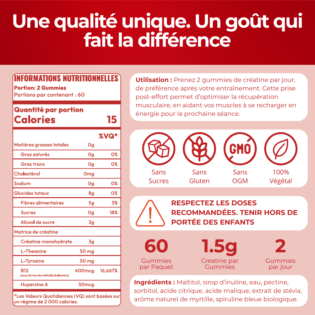 - 2 Gummies de 1.5g de créatine par jour